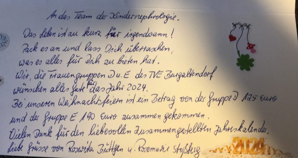 …werden die nierenkranken Kinder der Uni-Kinderklinik von den Gymnastik-Damen des TVE Burgaltendorf mit einer Weihnachtsspende bedacht. Und das schon seit über 15 Jahren !!!