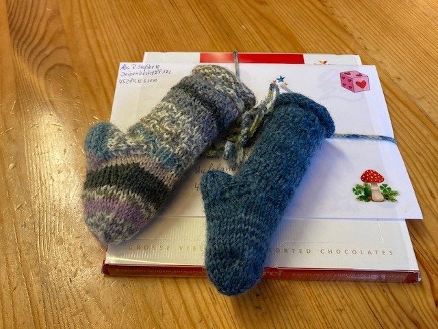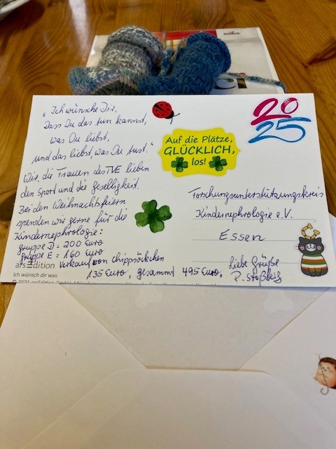 So lautete die Formulierung auf der jährlichen Karte, mit der Frau Stoßberg die schon berühmte „Spendenkarte“ des TVE Burgaltendorf überreichte. Natürlich blieb es nicht nur bei der schönen Karte. Es kam zudem noch die beachtliche Summe von insgesamt 360,- € zusammen, die bei den Weihnachtsfeiern der Damen-Turngruppen zusammen gekommen sind. Außerdem hatte Frau Stoßberg erneut Chips-Socken in mühevoller „Kleinarbeit“ hergestellt und damit zusätzlich 135,- € erstrickt.