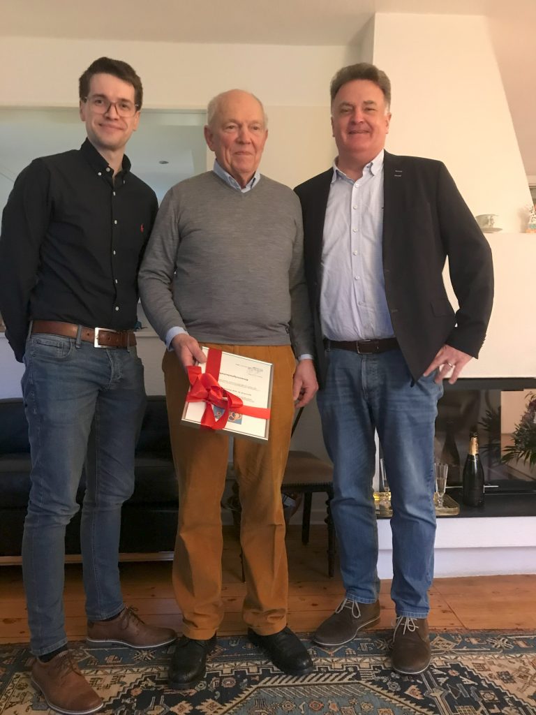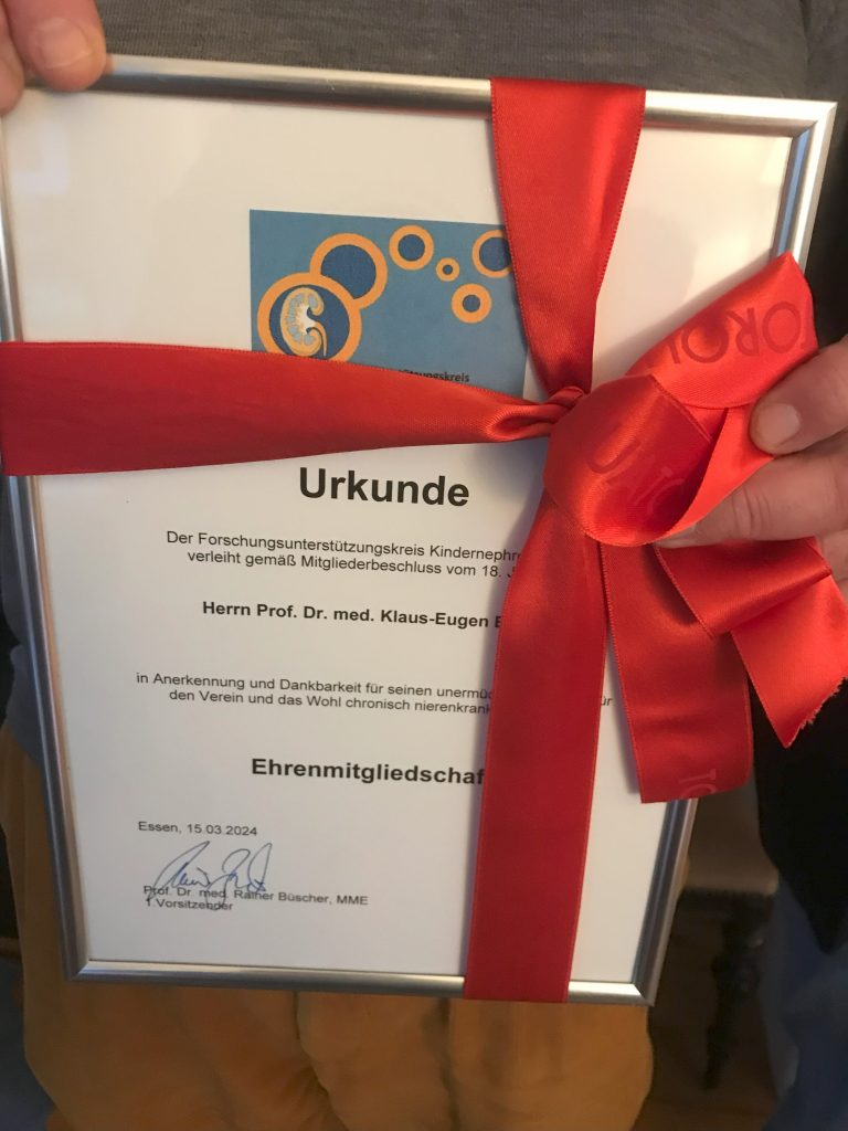 Auf der Mitgliederversammlung im Juli 2023 haben wir unseren langjährigen Vorsitzenden und Gründer unseres Vereins, Herrn Prof. Dr. Klaus-Eugen Bonzel, aus seiner aktiven Vereinsarbeit im Vorstand verabschiedet. Der Verein wäre ohne Prof. Bonzel und sein außerordentliches und leidenschaftliches Engagement für nierenkranke Kinder und Jugendliche und deren Familien nie entstanden und wir alle sind diesem großartigen Kinderarzt Dank schuldig. In Würdigung seiner Verdienste wurde er mit Vorstandbeschluss vom Juli 2023 zum ersten Ehrenmitglied des Vereins ernannt und der Vorstand verlieh ihm seine Ehrenurkunde dann auch persönlich im März dieses Jahres. Wir gratulieren ihm herzlich und wünschen ihm, seiner Frau Doris und der ganzen Familie noch ein langes und hoffentlich unbeschwertes Leben.